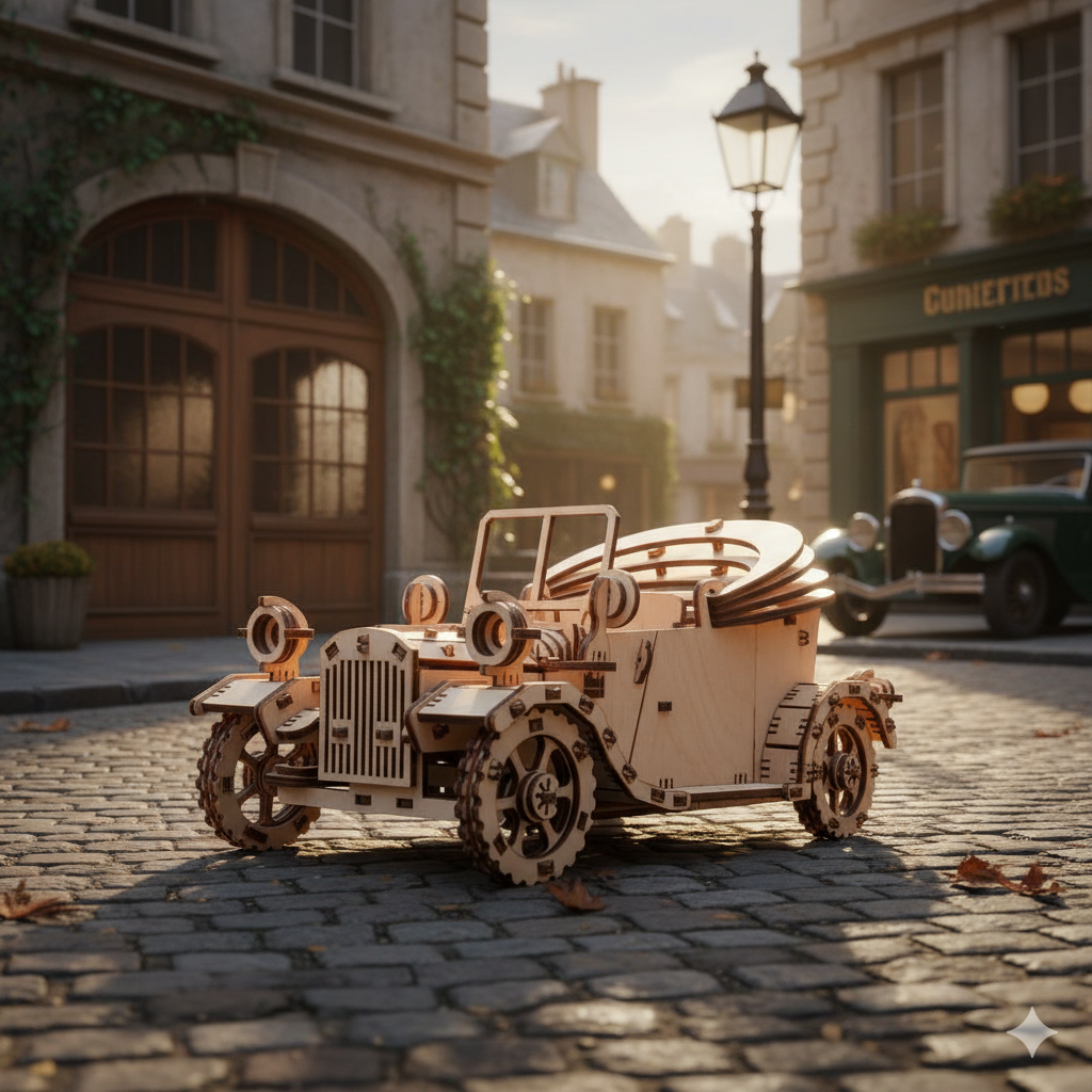 Scopri il fascino del passato con questa macchinina retrò in legno , realizzata con cura nei minimi dettagli, che ti trasporterà all'inizio del XX secolo. Questo modello non è un semplice puzzle: è una meraviglia meccanica che prende vita una volta assemblato grazie a un motore a elastico con meccanismo di bloccaggio.